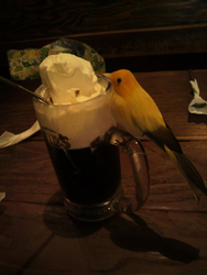 写真2は友人から誕生日にもらった鳥に、大事なコーシーゼリーを食われているところ。