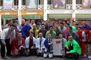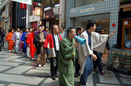 先日4/28(水)から30(金)の3日間にわたって大阪のミナミを舞台に開かれた大落語祭「第一回上方落語まつりinミナミ」に先立って、4月8日に、笑福亭銀瓶をリーダーにした若手落語家20名が大阪の心斎橋から舞台となる松竹座、トリイホールをまわり、なんばグランド花月前のワッハ上方までを練り歩きました。
