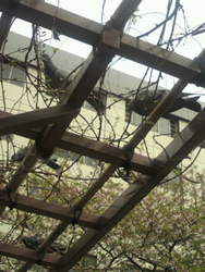 狭い憩いの緑のスペースにある藤棚が、