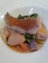 写真1 ちょっと頑張って行った四谷三丁目のカシュカシュで食べた「ハタ」というお魚と春野菜の炊き合わせ(フレンチなので違うかも)。