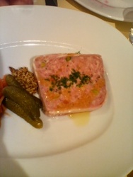 写真3:パテ・ド・カンパーニュです。これをやりながらワインをちびちびやるのがたまらなく好きです。パテは、あぶらのかたまりです。一切れ食べる事に二キロぐらい太っていっているような気がします。実際どんどん太って、わたしの背中姿は、丸みをおびてきているようです。ウエストのボタンが頑張っています。